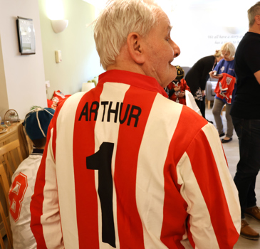 Arthur Harland, a resident at our sheltered scheme Albany House, wore his very own SAFC shirt from 1973 and brought his own photos and postcards to show volunteers from the museum and students from Grange Park Primary School.